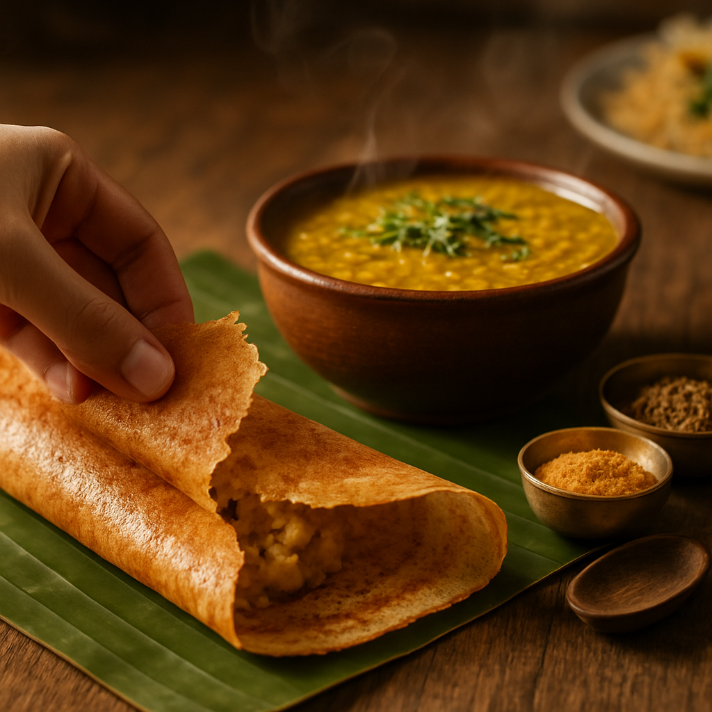 - Masala Dosa — knusprig, gefüllt mit würziger Kartoffelmasse; ein südindischer Klassiker.